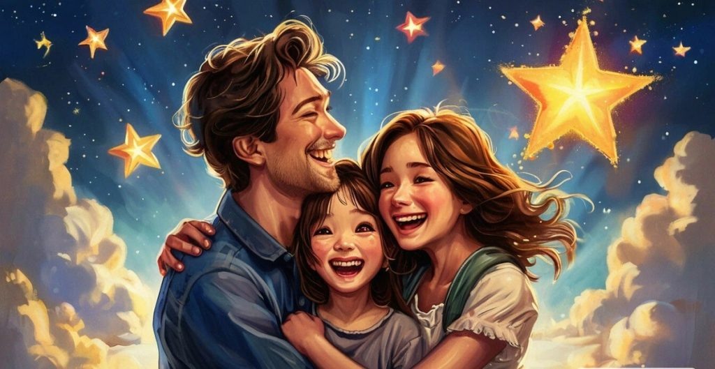 Жили-были на далёкой планете две светящиеся звезды: большая мама-звезда и папа-звезда, а с ними их маленькая дочка-звёздочка по имени Лучик. Лучик была самой яркой звёздочкой в галактике. Она любила играть с кометами, танцевать под мелодию космического ветра и наблюдать за тем, как её родители украшают ночь своим теплым светом. Однажды вечером мама-звезда и папа-звезда собрались сообщить Лучику важную новость: – Дорогой наш Лучик, – начала мама-звезда, – скоро у тебя появится новый братик или сестричка! Это будет ещё одна маленькая звёздочка, которая засияет рядом с нами! Лучик замерла. Её серебряный свет слегка потускнел. Она никогда раньше не думала об этом. Что, если теперь ей придётся делить своих родителей? Что, если они перестанут уделять ей столько внимания? Несколько дней спустя родилась маленькая звёздочка Миг. Она была такая крошечная и совсем не могла самостоятельно светить. Мама-звезда и папа-звезда постоянно были рядом с ней, помогали ей учиться быть ярче и теплее. Лучик с