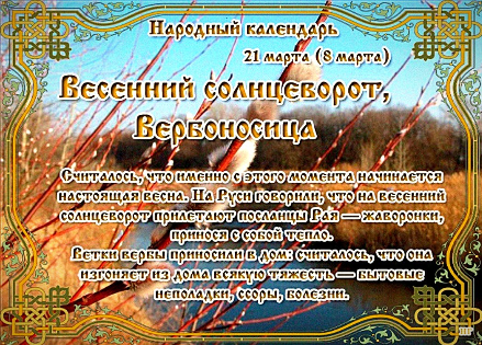 В субботу, 21 марта 2026 года, судят о том, будет ли урожай огородных овощей и яровых хлебов. В народном месяцеслове дата получила название Весеннее равноденствие, Весенний солнцеворот, Вербоносица, Вешнее равноденствие, Лазарь.