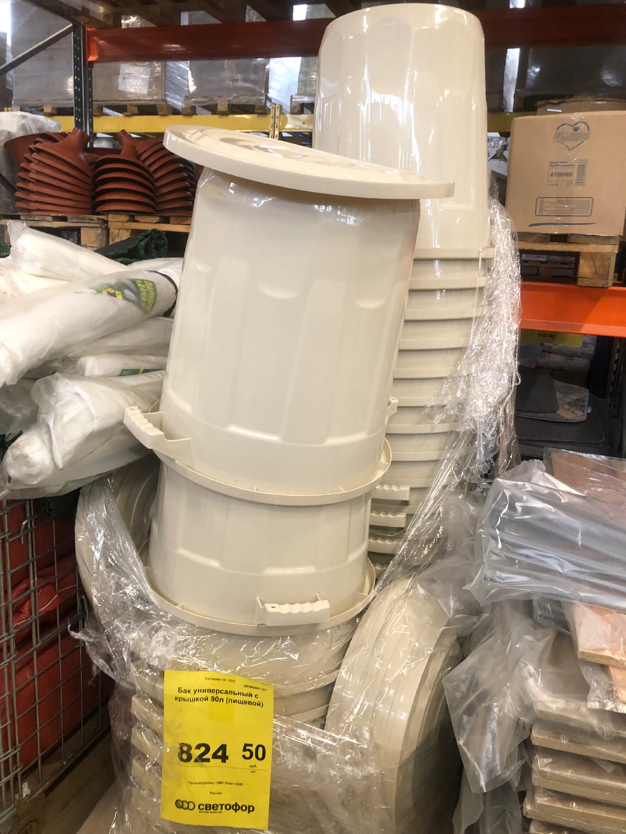 В наличии есть большие хозяйственные баки с крышкой и с ручками. Бак пластиковый, подходит для пищевых продуктов. Так что, если захотите квасить капусту или поставить бак в баню для холодной воды, самое то! Объем 90 литров. В Светофоре самая низкая цена на них, всего 824 рубля.