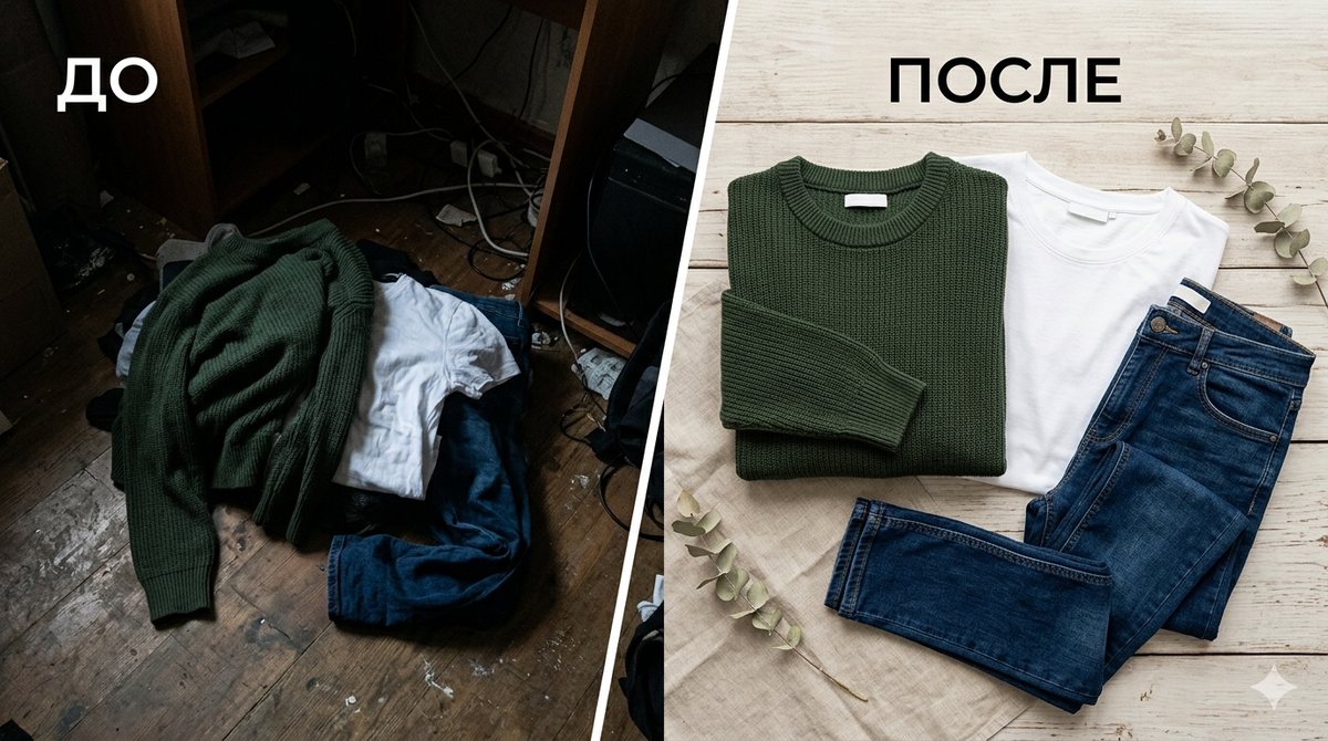 - Режим: портретный для одежды на модели, обычный для flatlay (раскладки)