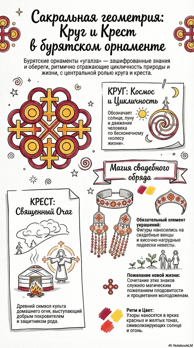Бурятские орнаменты «угалза» — это зашифрованные знания и обереги, ритмично отражающие цикличность природы. Центральную роль в этой системе занимают символы круга и креста. Круг: Космос и цикличность. Обозначает солнце, луну и движение человека по бесконечному «колесу жизни». Это символ вечного возвращения и гармонии мироздания. Крест: Священный Очаг. Древний символ культа домашнего огня, выступающий добрым покровителем и защитником рода. Магия свадебного обряда: Эти фигуры были обязательными элементами украшений невесты. Сочетание круга и креста служило магическим пожеланием плодородия и процветания молодоженам. Узоры наносятся в ярких красных и желтых тонах, олицетворяющих солнце и живое пламя. Канал нашей студии https://t.me/chimitdorzhi_studio