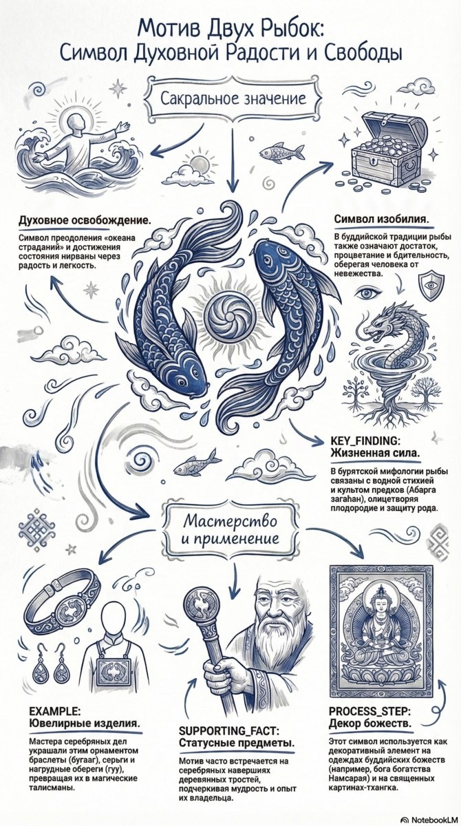 Орнамент с изображением двух рыбок — один из восьми благих символов в бурятской культуре, несущий глубокий философский смысл. В буддийской традиции рыбы олицетворяют духовное освобождение: способность человека преодолеть «океан страданий» и достичь состояния нирваны через радость и внутреннюю легкость. Сакральное значение: Рыбы также являются символом изобилия, процветания и бдительности, оберегая человека от невежества. В бурятской мифологии этот мотив тесно связан с водной стихией и культом предков (Абарга загаһан), олицетворяя плодородие и защиту рода. Мастерство и применение: Мастера серебряных дел украшают этим орнаментом браслеты (бугааг), серьги и нагрудные обереги (гуу). Мотив часто встречается на навершиях тростей, подчеркивая мудрость владельца, а также служит декоративным элементом на одеждах божеств и священных тханках. Канал нашей студии https://t.me/chimitdorzhi_studio