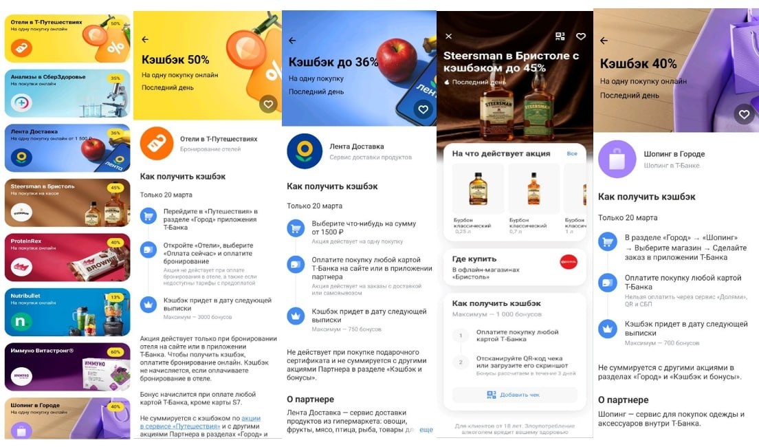 👑 Сегодня в кэшбэке дня может быть довольно много предложений с повышенным кэшбэком, например: ⛱ 50%, макс 3000 за 1 бронь в Т-Путешествиях 🚑 35% за Анализы в СберЗдоровье (+промокод), сдать можно в течение 14 дней после оплаты 🛒 36%, макс 750 за 1 покупку от 1500₽ в Ленте Доставке 🥃 45%, макс 1000 за бурбон Steersman на кассе в Бристоле 💊 60%, макс 3000 за Иммуно Витастронг в любых офлайн/онлайн аптеках 🛍 40%, макс 700 за 1 покупку в Шопинге в Городе *Для совмещения кэшбэка с промокодом в СберЗдоровье работал такой способ: открыть СберЗдоровье в браузере, ввести промокод вверху справа, авторизоваться, наполнить корзину (промокод должен к ней примениться), перейти по ссылке из приложения Т-Банка, открыть корзину, оплатить. 📌Для получения кэшбэка, необходимо просмотреть предложение - может быть не у всех. 👉Бонусы за оформление карт
