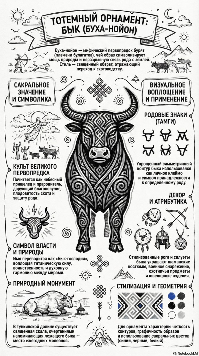 ) Буха-нойон — мифический первопредок бурят (в частности, племени булагатов), чей образ символизирует мощь природы и неразрывную связь рода с землей. Этот тотемный орнамент является священным оберегом, отражающим исторический переход народа к скотоводству. Символика и сакральный смысл: Имя переводится как «Бык-господин», воплощая титаническую силу, воинственность и духовную гармонию. Буха-нойон почитается как небесный прародитель, дарующий благополучие, плодовитость скота и защиту рода. В Тункинской долине до сих пор существует священная скала, очертаниями напоминающая лежащего быка. Визуальное воплощение: Упрощенный симметричный контур быка использовался как родовое клеймо (тамга). Стилизованные рога и силуэты украшают шаманские костюмы, военное снаряжение и ювелирные изделия. Для орнамента характерна четкость контуров и использование сакральных цветов: синего, черного и белого. Канал нашей студии https://t.me/chimitdorzhi_studio