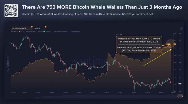 Уже третий месяц подряд китовые кошельки с балансами от 100 BTC активно покупают биткоин, несмотря на то, что цена BTC держится в боковом канале около 71,000$. По данным Santiment, количество таких кошельков превысило 20,000, что является рекордом и говорит о наращивании сильных рук в рынке. Эти крупные держатели после периода продажи начали аккумулировать активы, уменьшая объем продавцов и создавая фундамент для будущего роста. Для инвестора это важный сигнал: киты готовятся к возможному ралли, накапливая BTC в ожидании прорыва из боковика. Рынок сейчас консолидируется, но активность крупных игроков снижает вероятность резких спадов и повышает шансы на мощный отскок вверх. Держишь или ждешь коррекции? #новости #БезПафосаФинансы #BTC #киты #крипто ##БПФ_Day