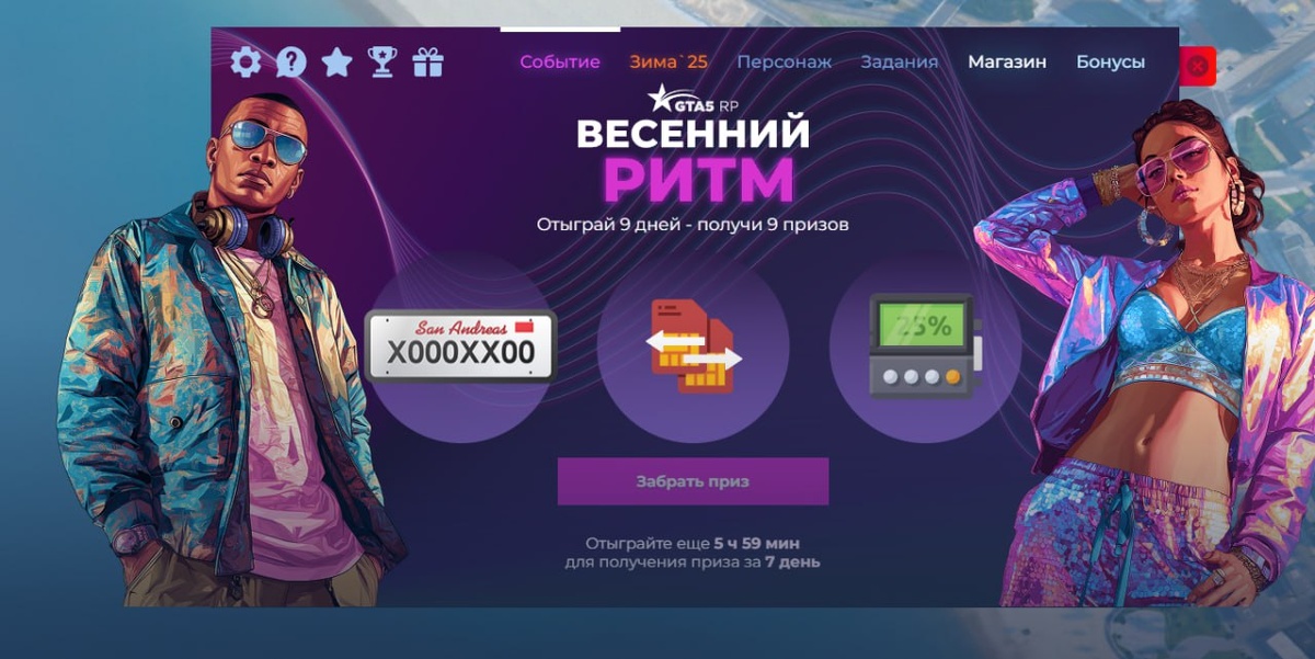 За седьмой день ивента «Весенний ритм» на GTA 5 RolePlay можно получить сброс пробега ИЛИ смену номера автомобиля ИЛИ смену номера телефона.