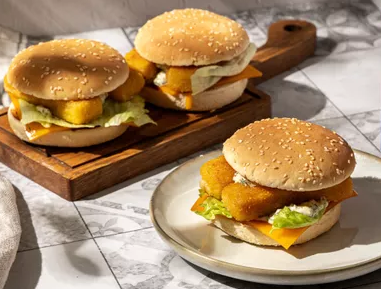 - Соберите бургер: на нижнюю часть булочки выложите сыр, затем листья салата и щедрую порцию соуса тартар.