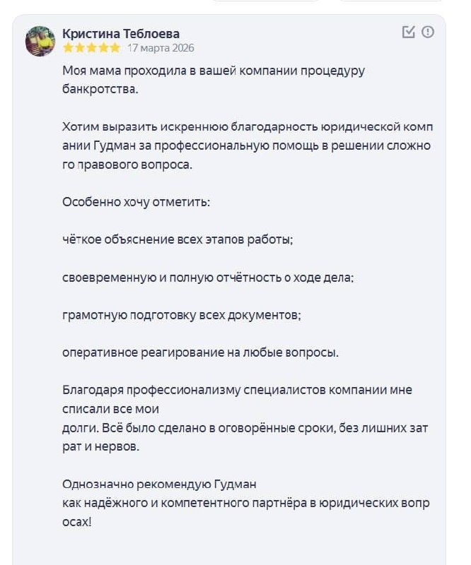🔹 Иногда к нам приходят не по рекламе, а по рекомендации близких. В этом случае процедуру банкротства проходила мама клиента — и именно такой формат доверия особенно ценен. С самого начала мы выстроили работу системно: — подробно объяснили каждый этап процедуры, — зафиксировали сроки и порядок действий, — обеспечили регулярную отчётность по делу, — взяли на себя полную подготовку документов и взаимодействие с судом. Клиент отмечает: «Чёткое объяснение всех этапов работы, своевременная и полная отчётность, грамотная подготовка документов, оперативное реагирование на любые вопросы». Это именно тот стандарт, которого мы придерживаемся: никакой неопределённости — только прозрачный процесс и контроль на каждом этапе. Результат — полное списание долгов в установленные сроки и без лишней нагрузки на клиента. «Всё было сделано в оговорённые сроки, без лишних затрат нервов». Для нас важно, что итог оценили не только с юридической точки зрения, но и с человеческой: спокойствие, понятност