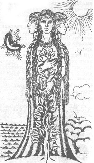Также сокращенно именовалась Тригла. Сия богиня не имела храма в городах и селениях, а находился он на полях киевских; истукан же ея представлял женщину о трех головах. Славяне, кажется, благоразумно поступали, не вмещая храма богини, изображавшей землю, среди жилищ. Три ея главы означают три начала, составляющие земной шар, т. е. земля, вода и воздух, ибо существование огня полагалось вне земли. Сему доказательством служит Прометей, похитивший огонь с неба. Нет ничего лучше сей догадки, как поставить храм земли под открытым небом, поелику самое изображение сего храма и богини значило землю. Сверх сего три ея главы могут представлять собою горы, долины и леса. В смысле же отвлеченном, богиня сия, кажется, изображала продолжение времени, настоящее, прошедшее и будущее. По причине пользы, получаемой от скота, коего сей бог почитался покровителем, после Перуна, бога ужаса, Волосу, подателю через сохранение скота великих польз и благ людям, воздавалось величайшее почитание. Самое имя озн
