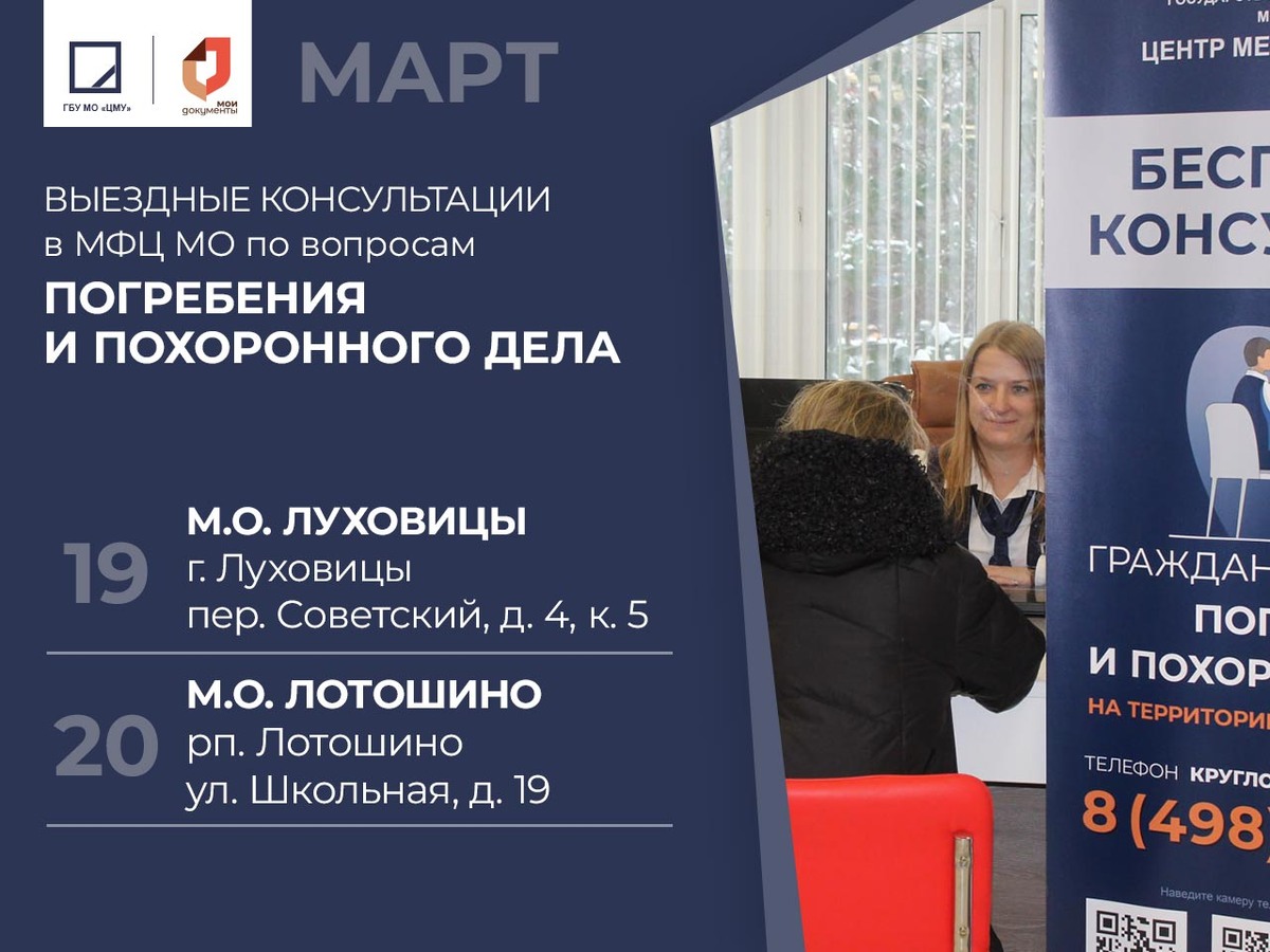 Бесплатные консультации от специалистов ГБУ МО «Центр мемориальных услуг» по вопросам погребения и похоронного дела в МФЦ вашего города 19.03.2026 Московская обл., м.о. Луховицы, г. Луховицы, пер. Советский, д. 4, к. 5 20.03.2026 Московская обл., м.о. Лотошино, рп. Лотошино, ул. Школьная, д. 19 В указанные дни консультанты ГБУ МО "ЦМУ" предоставят бесплатную консультационную помощь в сфере погребения и похоронного дела, подскажут последовательность действий, проинформируют об оформлении необходимых документов. Также получить бесплатную консультацию в сфере погребения и похоронного дела можно удаленно, обратившись на круглосуточную горячую линию ГБУ МО "ЦМУ" по номеру телефона 8 (498) 568-99-99 Анонсы выездных консультаций можно найти на наших официальных страницах в социальных сетях: Telegram: https://t.me/memorial_mo Одноклассники: https://ok.ru/memorialmo Дзен: https://dzen.ru/memorialmo ВК: https://vk.com/memorial_mo