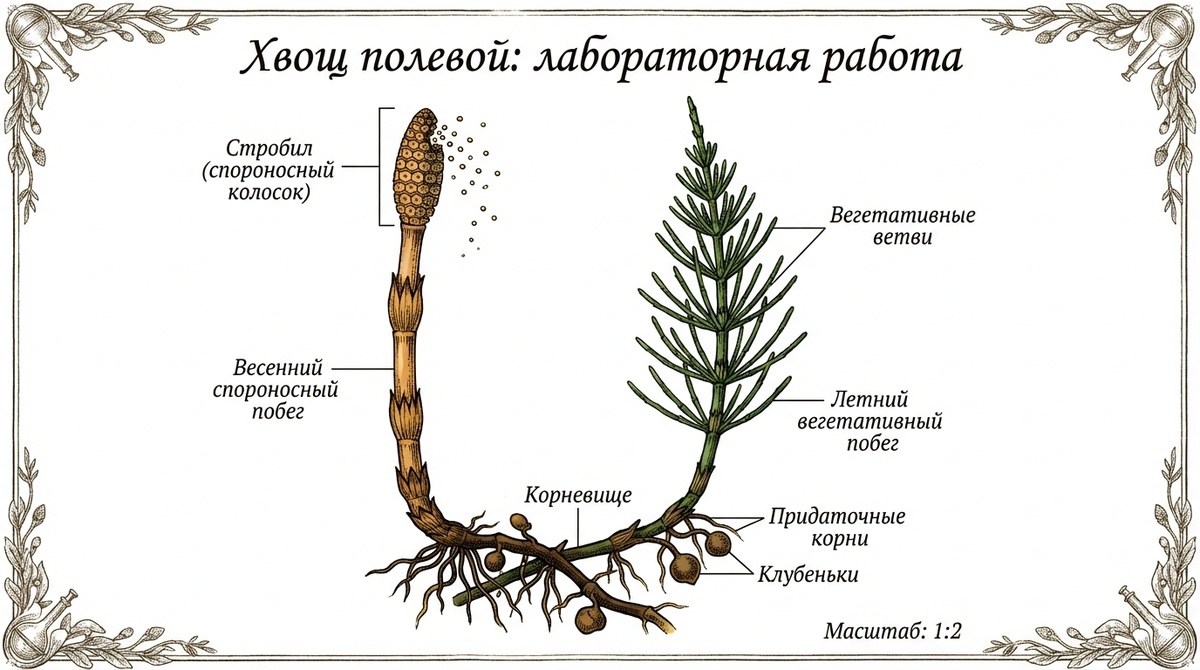 Когда биологичка выдала мне гербарий хвоща, я честно не понял, что это вообще. Выглядит как маленькая ёлочка, которая перепутала эпоху. Потом выяснилось — это буквально так. Хвощи существуют на Земле около 400 миллионов лет. Для сравнения: динозавры появились примерно через сто миллионов лет после первых хвощей. Получается, ты делаешь лабораторную работу по изучению внешнего строения хвоща — и держишь в руках одно из самых живучих растений планеты. У хвоща полевого весной появляется один тип побегов, летом — другой. Это не два разных вида, это одно растение в разных «режимах». Весенний побег — бурый, без хлорофилла, похож на розовато-коричневую свечку. На его верхушке — спороносный колосок (стробил). Вся задача этого побега — выпустить споры и умереть. Летний побег — зелёный, с мутовками (так называют «этажи» боковых веточек). Он уже занимается фотосинтезом. Если в лабораторной работе попался гербарий весеннего побега — ищи колосок на верхушке. Попался летний — считай мутовки, смотри