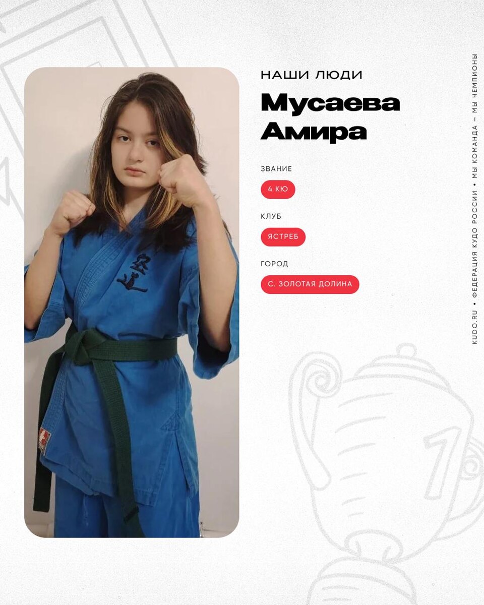 ⠀ 🥋 Мусаева Амира — 4 кю Яркая спортсменка со стальным характером. Занимается кудо большую часть жизни. Побеждает благодаря упорным тренировкам. Черпает мотивацию в родительской поддержке. ⛩ Спортивный клуб — «Ястреб» 📍 Город проживания — с. Золотая Долина Амира Мусаева учится в 7 классе и увлекается рисованием. Сейчас девочке 13 лет, 8 из которых она занимается кудо. В секцию единоборств спортсменку привели родители, и она сразу почувствовала, что это именно тот спорт, который ей нужен. 👉 Читайте интервью на нашем сайте — https://kudo.ru/people/musaeva-amira/ 🥲Федерация кудо России в MAX
