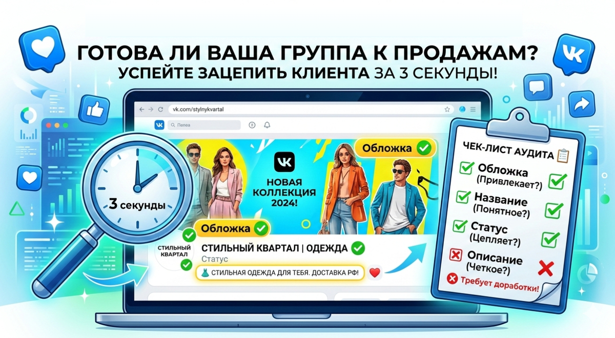У вас есть всего 3 секунды, чтобы зацепить потенциального клиента, когда он заходит в вашу группу ВК. Если обложка, статус или описание непонятные — человек уходит к конкурентам. Давайте проверим, насколько ваша группа готова к продажам! Напишите "Аудит шапки сообщества" в сообщения группы ВК