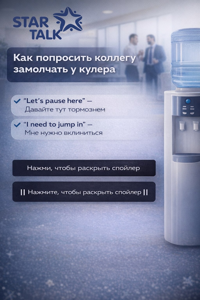 Забудьте сказки про «Real English». Shut up — грубо, но привычно. Zip it (Захлопнись/Застегни рот на молнию) — это не просто грубо, это унизительно. Так говорят подросткам в американских комедиях или близким друзьям, когда вы пьете третье пиво. Хотите звучать как профи? Используйте пассивную агрессию корпоратов: «Let’s pause here» (Давайте тут тормознем) или «I need to jump in» (Мне нужно вклиниться). Нажми на черную полосу, чтобы узнать, как изящно прервать босса на созвоне: «That’s a great point, let’s park it for now» (Отличная мысль, давайте пока ее отложим).