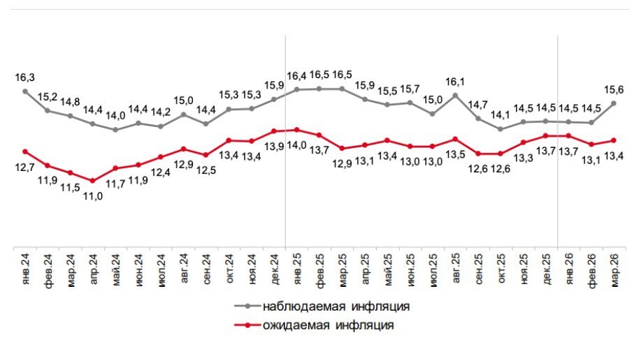 ЦБ может сегодня и не снизить ставку Инфляционные ожидания В марте рост с 13,1% в феврале до 13,4% Наблюдаемая инфляция В марте рост с 14,5% в феврале до 15,6% Думаю про официальную инфляцию (ниже 6%) и наблюдаемую инфляцию, вспомнил анекдот «Специалисты говорят, что наш народ стал жить лучше. — А люди утверждают, что ничего не ощущают. — Но ведь эти люди же не специалисты».