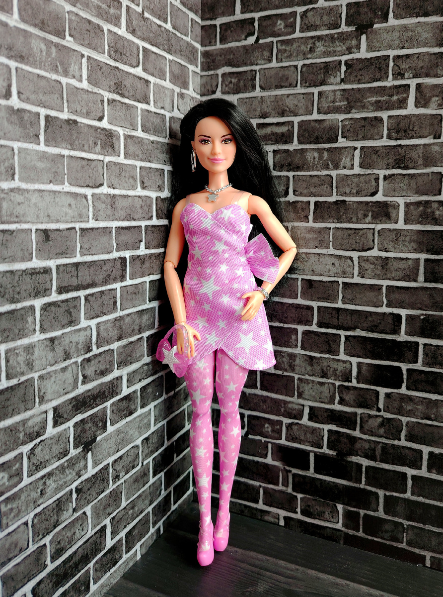 Который, как мне кажется, совсем ей не идёт. Об аксессуарах я, пожалуй, тактично промолчу. Платье сшито как будто из клеенки. Возможно, на какой-то Барби оно и будет неплохо смотреться, но только не на его хозяйке😆 А вот колготки - они, как говорится, и в Африке - колготки, очень полезная и нужная вещь в кукольном (и не только) гардеробе. Эти вполне неплохие. Но, опять-таки, в дополнение к другому наряду.