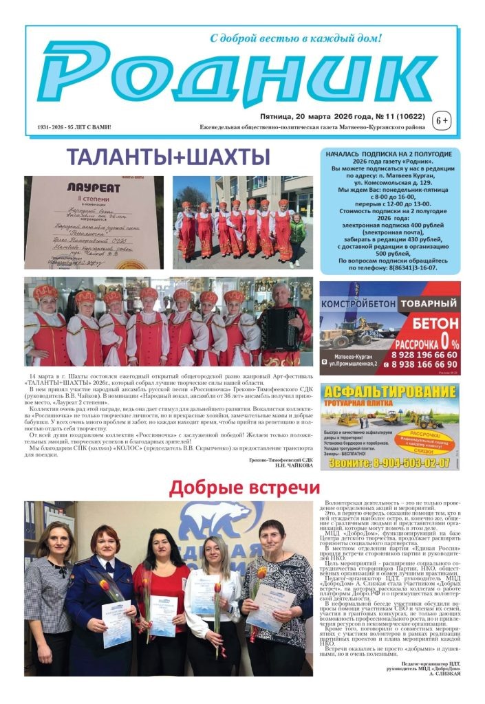 в г. Шахты состоялся ежегодный открытый общегородской разно жанровый Арт-фестиваль «ТАЛАНТЫ+ШАХТЫ». Стр. 1. После капитального ремонта вновь распахнул свои двери детский сад № 1 «Аленушка» в Матвеевом Кургане. Стр. 2. В Администрации Матвеево-Курганского района состоялось очередное заседание административной комиссии. Стр. 2. Исполняющий полномочия главы района Дина Ал борова, провела прием жителей по личным вопросам. Стр. 2. В рубрике «Сад, огород» донской эксперт о работах в саду в марте. Стр. 7. В Матвеево-Курганском районе были проведены районные юнармейские военно-спортивные соревнования. Стр. 9. О главных событиях уходящей недели на странице Администрации Матвеево-Курганского района. Донские вести, новости культуры и спорта, события недели и информация социальных служб, полезная для каждого. Больше материалов на нашем сайте: https://rodnik-gazeta.ru Материалы газеты доступны в пабликах: https://t.me/rodnikgazeta