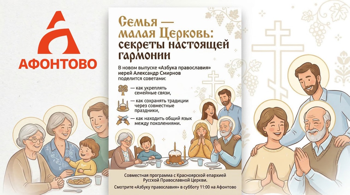 Как создать в семье атмосферу тепла, взаимного уважения и единства? Гармония — это не удача, а ежедневная работа души. Семья может стать настоящей «малой Церковью», если в её центре — вера, любовь и совместные традиции. В новом выпуске «Азбуки православия» иерей Александр Смирнов поделится советами: — как укреплять семейные связи, — как сохранять традиции через совместные праздники, — как находить общий язык между поколениями. Пусть ваша семья будет крепкой и наполненной Божьей благодатью! Смотрите программу «Азбука православия» на канале Афонтово в субботу 21 марта в 11:00 и 14:00 Подписаться на МАХ-канал Афонтово