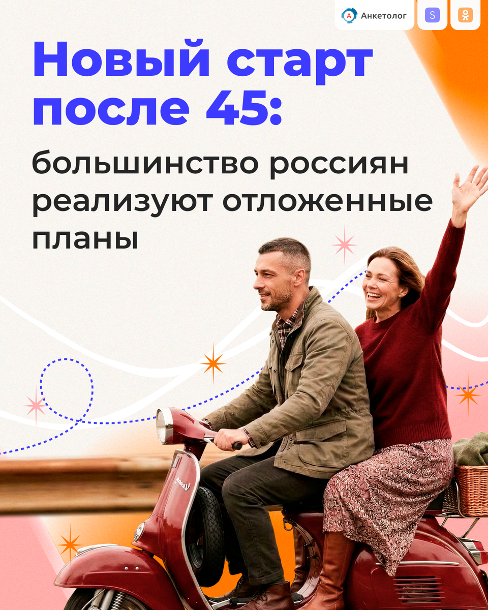 Более половины россиян старше 45 лет (52%) сообщили, что в зрелом возрасте начали заниматься тем, что раньше откладывали: сделали первые шаги в новом направлении или приступили к давно запланированным занятиям. Об этом свидетельствуют результаты опроса, проведенного сервисом маркетинговых исследований Anketolog.ru совместно с образовательным холдингом Skillbox и социальной сетью Одноклассники. Согласно исследованию, 72% респондентов отмечают, что сегодня располагают большим количеством свободного времени, чем раньше. Освободившийся ресурс они направляют на новые занятия и развитие: почти половина (48%) рассматривают обучение как способ дополнительного дохода, 46% — как источник удовольствия и интереса, а 43% — для умственной «зарядки». Сегодня больше всего времени россияне старше 45 лет тратят на дом и быт (46%), интернет и социальные сети (38%) и работу или подработку (37%). Однако, распределение времени не всегда совпадает с их приоритетами — респонденты хотели бы уделять больше врем