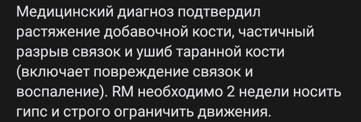 RM необходимо 2 недели носить гипс и строго ограничить движения.