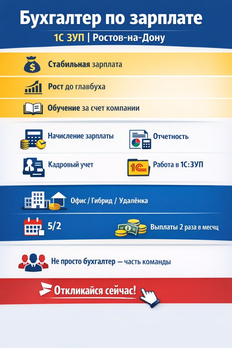 🔥🔥🔥В связи с расширением бизнеса приглашаем 👩🏻💻Бухгалтер по заработной плате | 1С ЗУП | Ростов-на-Дону Если ты просто «начисляешь зарплату» — не откликайся. Если ты понимаешь, что зарплата — это зона риска бизнеса и умеешь держать её под контролем — давай знакомиться. 💼 Кто мы ООО «Ваш ПрофБух» — консалтинговая компания с 9-летним опытом. Мы не про «тихо вести учет». Мы про порядок, систему и спокойствие клиентов. У нас: — несколько компаний одновременно — разные отрасли → быстрый рост — сильная команда, где помогают, а не «выживают» 🔥 Чем ты будешь заниматься — Начисление зарплаты: оклады, премии, отпускные, больничные, декретные — Работа с суммированным учетом рабочего времени — Расчет при увольнении — Сдача отчетности (ФНС, фонды) — Кадровые движения: приемы, переводы, увольнения — Работа в 1С:ЗУП 8.3 — Подготовка справок и ответов на требования 👉 Важно: Ты не просто считаешь — ты контролируешь порядок и точность 📌 Что нам важно — Опыт от 3 лет именно по зарпл