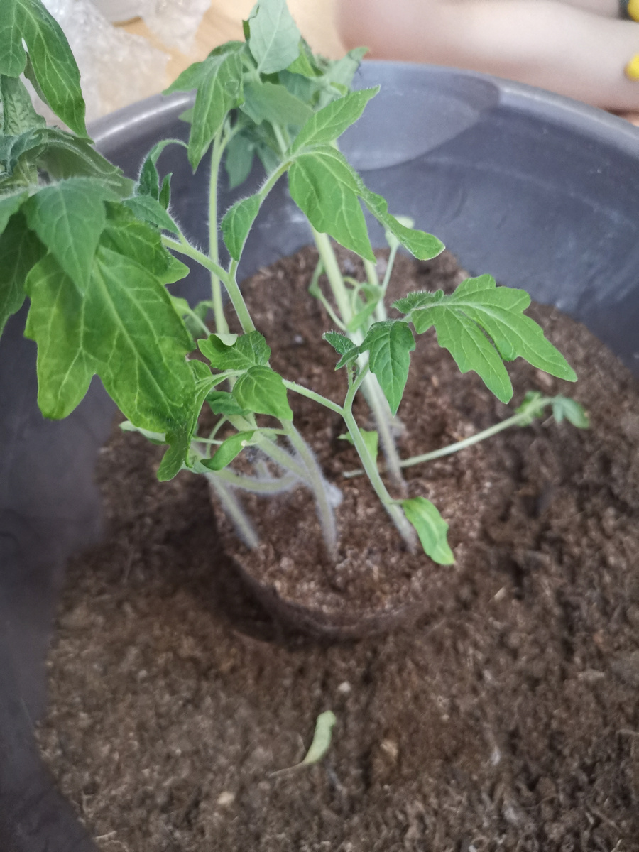 Вчера рассаживали 9 кустов томата «Домашний» от «Партнёра». 10-й был совсем слабый, выкинула его. Паша всем кустикам присвоил имена: это Паша, это будешь ты (я, мама), это папа, бабушек и дедушек по именам и прабабушку. Ещё одну прабабушку пересадим завтра из другого. Ну просто кустиков немного не хватило на многочисленную семью.