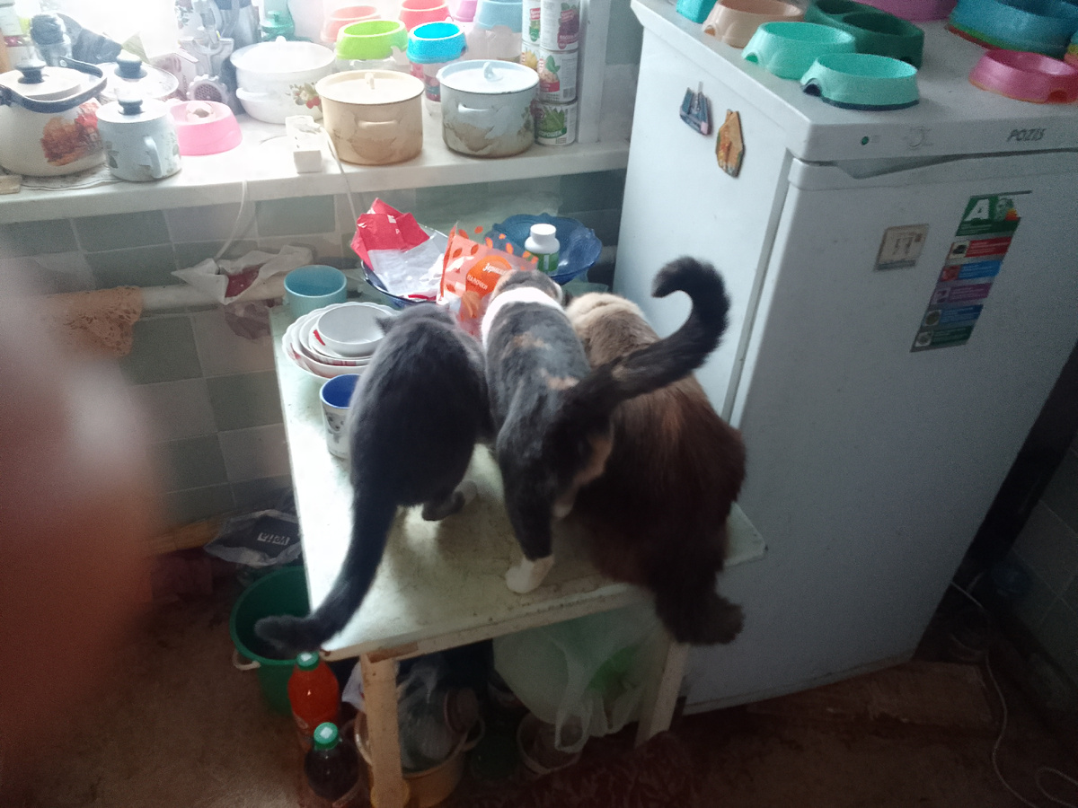 На кухни весело. Туда Серж регулярно заходит. А выходит с мисками с кормом. Исчо интиресна что сам Серж кушает.