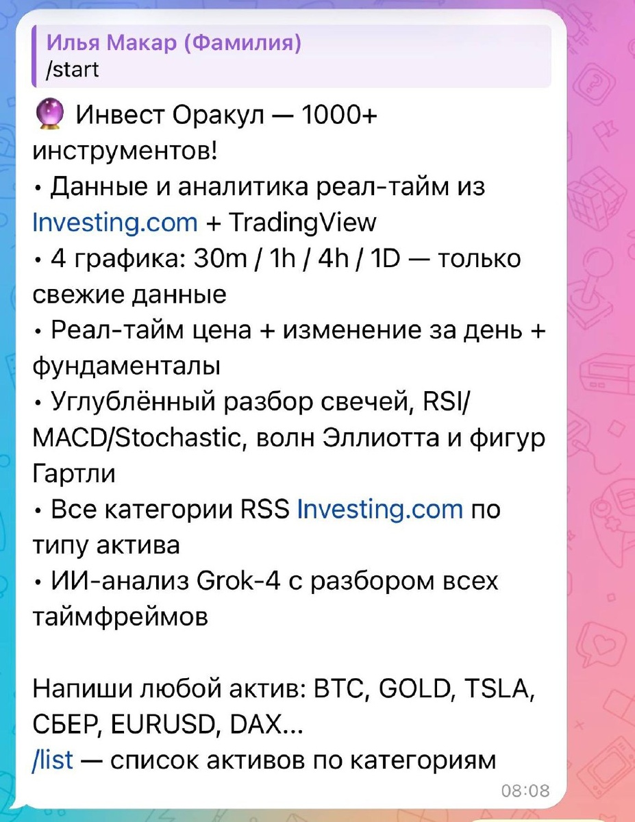 ? Тратить часы на графики, а потом смотреть, как рынок уходит в другую сторону? Мучиться от FOMO, перекупленности и "а вдруг сейчас развернётся"? ХВАТИТ. С сегодняшнего дня у вас есть настоящий ИИ-помощник, который делает ВСЮ работу за вас 24/7 без эмоций, без усталости и без ошибок новичка. Представляю Вам — самого мощного торгового бота 2026 года! Что он делает прямо сейчас (прямо как на скринах, которые я прикрепил): Полный технический + фундаментальный анализ в реальном времени Глубокий разбор волн Эллиотта + фигуры Гартли (Bullish Butterfly, Bat, Crab) с точными целями по Фибоначчи Все ключевые индикаторы сразу: Bollinger, Ichimoku, RSI, MACD, Stochastic, CCI, ADX + уровни поддержки/сопротивления Мульти-таймфрейм (30м / 1ч / 4ч / 1D / 1W) — видит картину от минут до месяцев Новости в реальном времени с краткими комментариями: как ФРС, инфляция, ботнеты, ставки по ипотеке и т.д. влияют именно на ваш актив Графики с SMA 10/20/50 + объём прямо в чате (Yahoo Finance real-time) Сиг