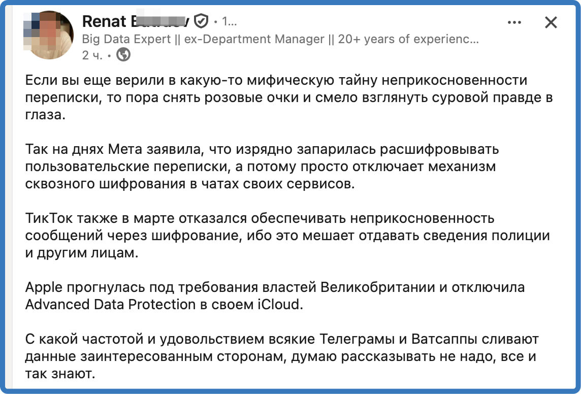 "...на днях Мета заявила, что изрядно запарилась расшифровывать пользовательские переписки, а потому просто отключает механизм сквозного шифрования в чатах своих сервисов." или вот: "ТикТок также в марте отказался обеспечивать неприкосновенность сообщений через шифрование, ибо это мешает отдавать сведения полиции и другим лицам." или еще: "Apple прогнулась под требования властей Великобритании и отключила Advanced Data Protection в своем iCloud." Или это другое, а мы просто не понимаем? :) @clickfraud.ru