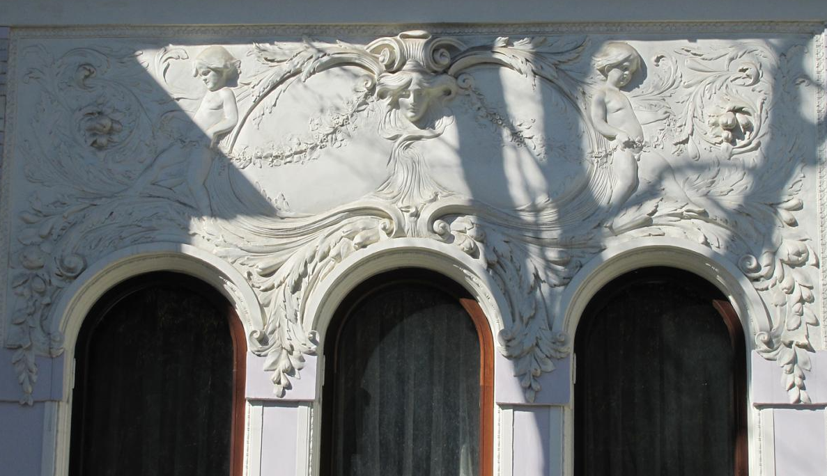 Возьмём для примера доходный дом Кекушевой на Остоженке, 43. Подходим к фасаду. Первое, что бросается в глаза - пара львов у входа. Спокойные, с закрытыми глазами - стражи, охраняющие покой. Поднимаем взгляд: между окнами второго этажа - женские маски с мягкими чертами. Это аллегории искусств, отсылка к культурным интересам владельцев. Карниз украшен растительным орнаментом: стилизованные цветы и листья - типичный приём модерна, символизирующий связь с природой.