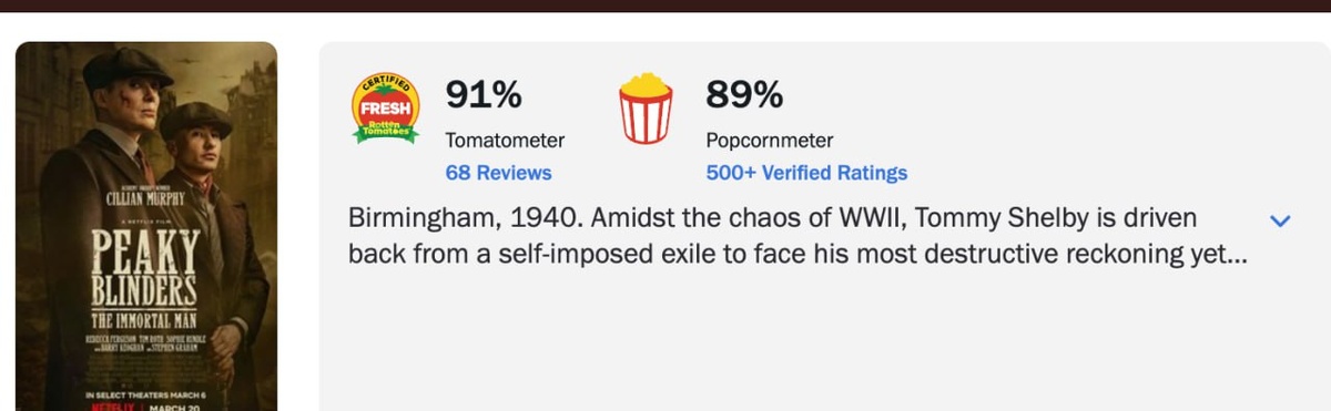⚡️ Фильм «Острые козырьки: Бессмертный человек» выходит СЕГОДНЯ — лента очень зашла зрителям: 89% свежести на Rotten Tomatoes