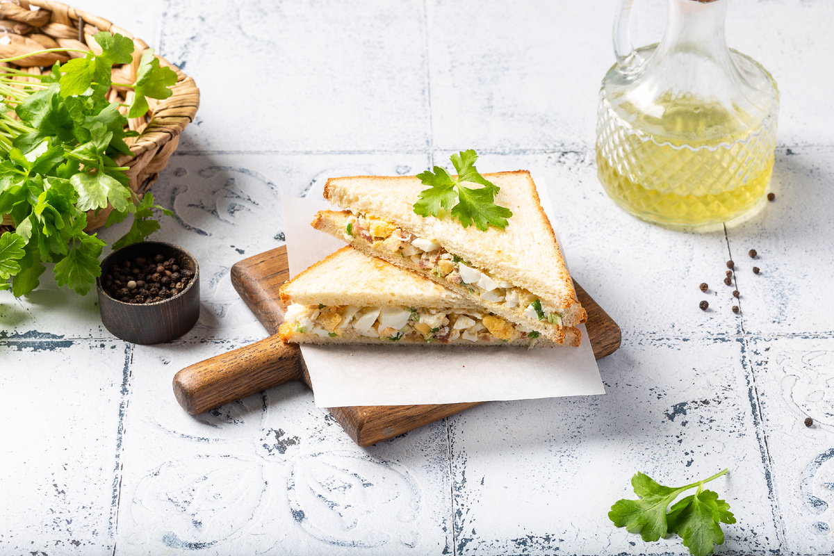 Основательный вариант сэндвича: с ним вы забудете о голоде надолго. Если бекон не ваш фаворит, замените его ветчиной из индейки — получится не менее вкусно. 1️⃣ Яйца сварите вкрутую и нарежьте мелким кубиком. 2️⃣ Порубите бекон и обжарьте в течение 1–2 минут. 3️⃣ Смешайте яйцо с беконом, мелко порезанным луком, специями и сливками. 4️⃣ Поджарьте слегка тостовый хлеб и выложите на него начинку.