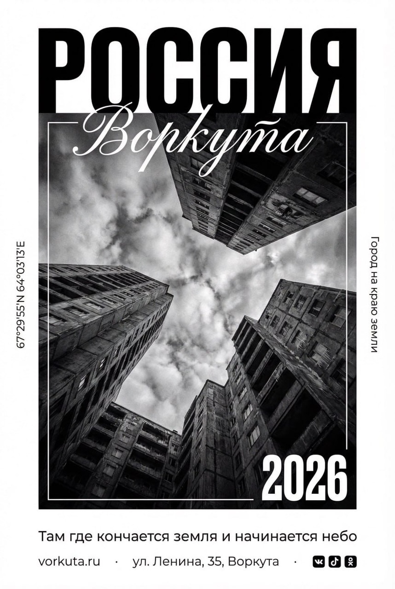 Создаёте чёрно-белый editorial-постер в стиле европейских travel-журналов. Драматичная архитектурная фотография + крупная типографика + координаты — готовый визуал для городских проектов или личных коллекций. AI Wiz собирает композицию в стиле швейцарской графики: чёрно-белое фото с низкого ракурса (worm's eye view), массивный заголовок со страной, рукописное название города, координаты по бокам, слоган внизу. Всё на русском, минимализм, высокий контраст. 💡 Где использовать: ✅Туристические агентства — постеры для офиса или рекламных материалов с вашими направлениями. ✅Городские проекты и музеи — серия постеров о достопримечательностях города для выставок. ✅Гостиницы и хостелы — декор стен с локальными landmarks и координатами. ✅Сувенирная продукция — принты на футболки, кружки, открытки для туристов. Промпт: "[СТРАНА / ГОРОД — например: РОССИЯ / Воркута] Goal: Generate a minimalist black-and-white editorial poster in the style of high-end European travel magazine. 1. PHOTOGR