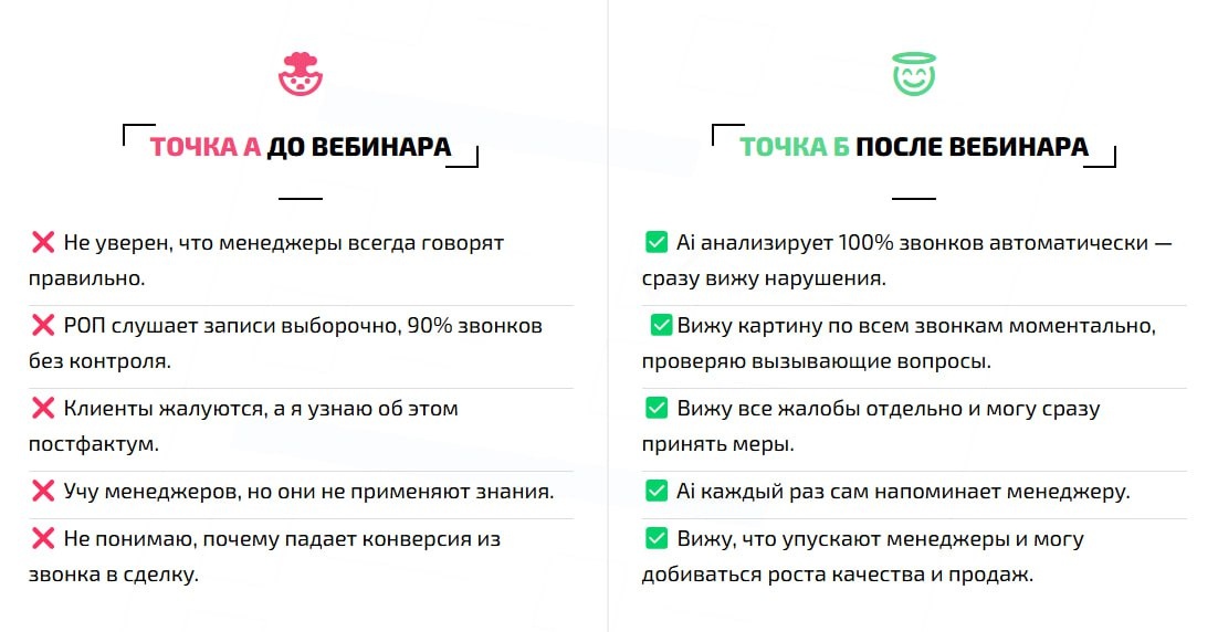 ! Источники лидов иссякают, а стоимость постоянно растет. Это реальность последних лет. Важно продать каждому и не потерять своих постоянных клиентов. На передний план выходит контроль работы менеджеров с клиентам. Но, слушать каждый звонок - практически нереально и мы не знаем полной картины. 📆 24 марта в 11:00 (мск) на бесплатном вебинаре расскажем, как искусственный интеллект уже помогает решить эту проблему в Битрикс24. Расскажем и покажем: 📌Возможности автоконтроля в Битрикс24 📌Как работать с BitrixGPT и СейлсЧек для качественного автоконтроля 📌Как трактовать отчеты 📌3 важные составляющие оцифровки звонков 📌Какие боли и как Ai контроль решит для собственника, РОПа, маркетолога, hr-специалиста 📌Как строить программу развития отдела продаж с помощью Ai Кому будет полезно: собственникам, РОПам, маркетологам, HR Продолжительность: 30-40 минут + ответы на ваши вопросы. 👉 Зарегистрироваться на вебинар: https://kit-media.ru/sales_Ai-control/