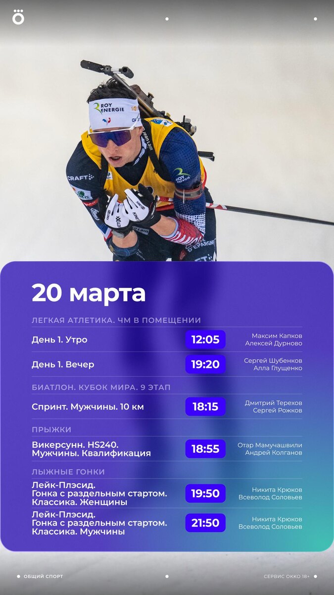 Очень много вечерних трансляций 🔥 Сегодня смотрим первый день ЧМ по легкой атлетике, биатлон и лыжные гонки, Евролигу, «Чемпионс» и клубный футбол. 😍 Смотри весь спорт в Okko: https://okko.tv/s/4ot