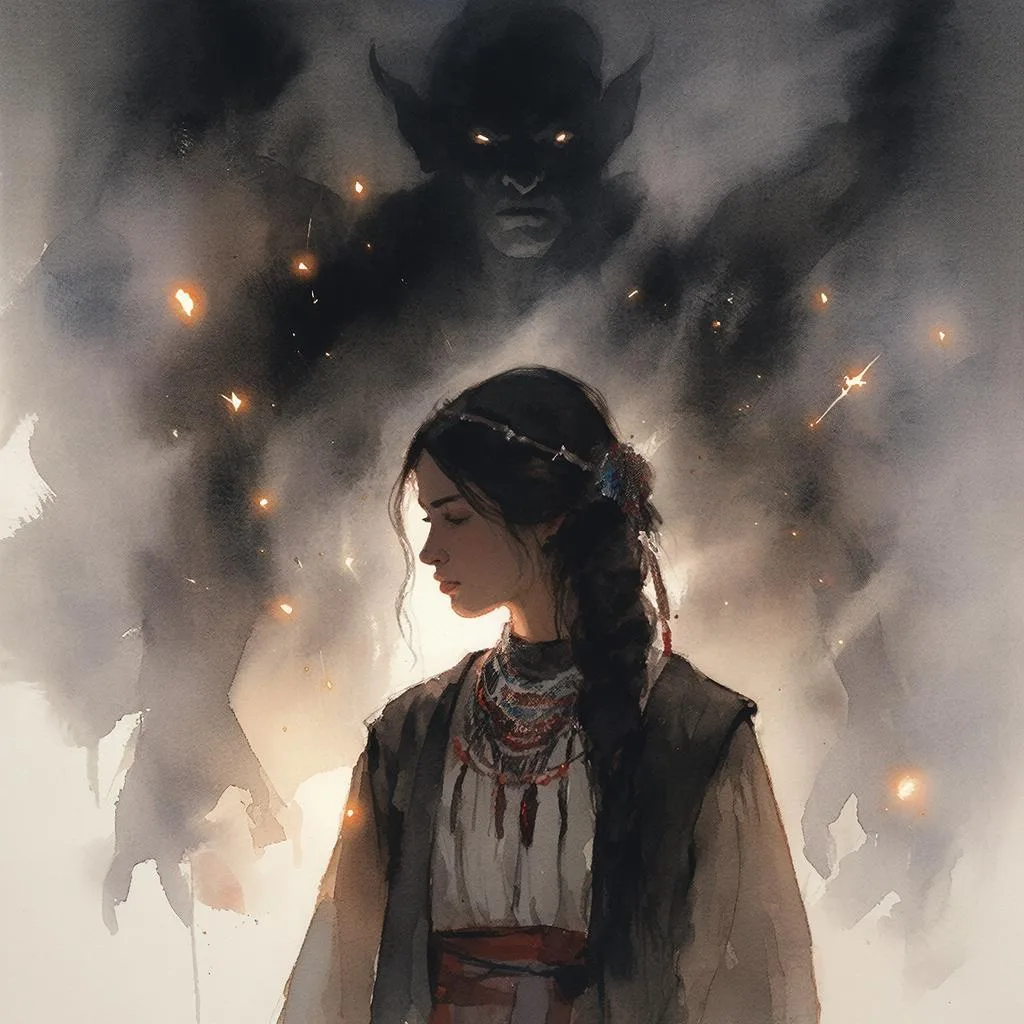 В тот же миг свечи вспыхнули синим пламенем, а в центре круга появился силуэт — размытый, колеблющийся, с горящими янтарными глазами. Воздух наполнился шипением и смехом, похожим на скрежет железа.