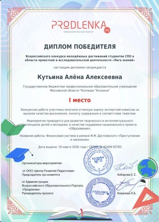 🎉 Наша студентка — победитель Всероссийского конкурса! 🥇 С огромной радостью сообщаем: студентка #КолледжКоломна Кутьина Алёна Алексеевна, обучающаяся по специальности 38.02.01 Экономика и бухгалтерский учет, одержала победу во Всероссийском конкурсе молодёжных достижений студентов СПО в области проектной и исследовательской деятельности «Лига знаний»! 📚Работа была посвящена изучению финансовой системы в романе Ф. М. Достоевского «Преступление и наказание». Её работа была отмечена за: ✔️ актуальность и научную значимость; ✔️ глубину проработки темы; ✔️ оригинальность подхода и практическую ценность; ✔️ убедительную презентацию и ответы на вопросы жюри. 👏🏻 Поздравляем Алёну и ее руководителя Мелентьеву В. В. с заслуженной победой! Желаем не останавливаться на достигнутом, смело идти к новым вершинам и покорять самые амбициозные цели! #КолледжКоломна #СПОмедиа