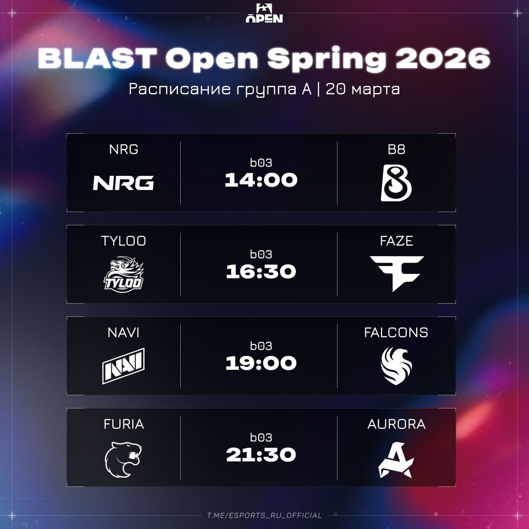 Начнем день с матчей нижней сетки: 🇺🇸 NRG vs B8 🇺🇦 🇨🇳 TYLOO vs FaZe 🇪🇺 Продолжим день матчами верхней сетки: 🇪🇺 NAVI vs Falcons 🇩🇰 🇧🇷 FURIA vs Aurora 🇷🇺 👍 Esports.ru | CS