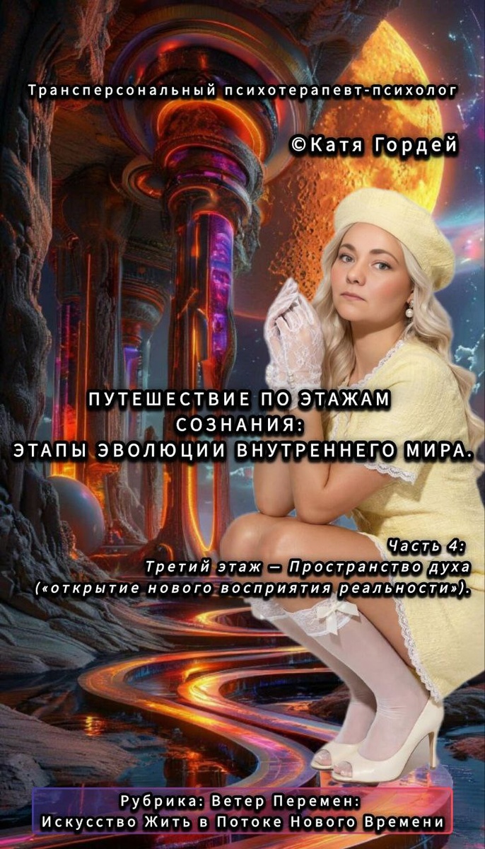 ◼️◼️◼️◼️◼️ 😍Путешествие по этажам сознания: этапы эволюции внутреннего мира. 😍 Часть 4: Третий этаж — Пространство духа («открытие нового восприятия реальности»). 😍Поднимемся на третий этаж нашего внутреннего путешествия, где раскрываются тайны духовного измерения. Здесь наши стремления перестают фокусироваться исключительно на материальном благополучии («машины», «успех», «отношения»). Теперь важнее внутренняя гармония и покой, чувство глубокой уверенности в правильности выбранного пути. Даже если завтрашнего дня не видно ясно, душа точно знает, куда движется. 😍Это состояние не означает пассивного отказа от жизненных удовольствий, а скорее приятие естественного течения жизни. Умение отпустить то, что потерялось, понимая, что ненужное ушло, освобождая место новому. Такое спокойствие приходит не сразу — важно пройти предыдущие этапы, исцелив внутренние раны и научившись осознанному выбору. В противном случае возникает риск поверхностной святости, фальшивого высокодуховного образа