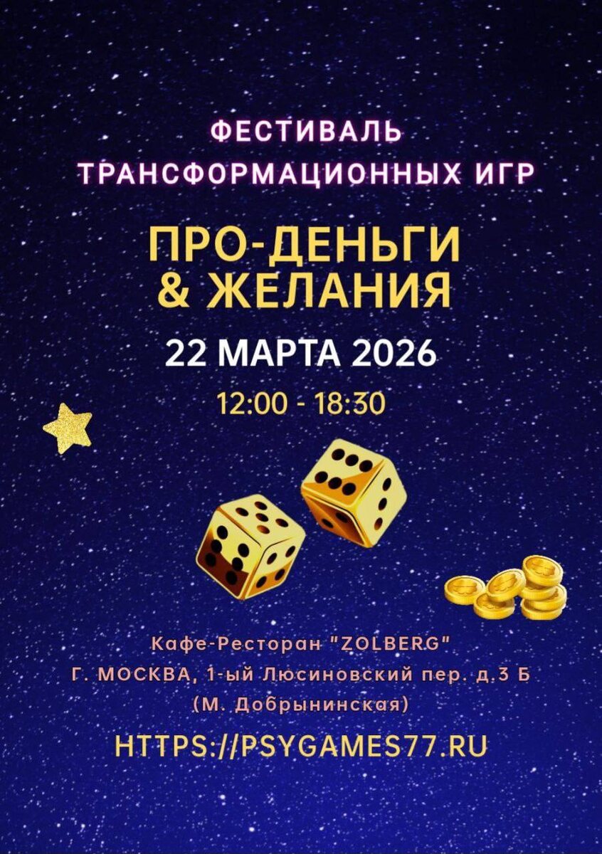 🧑🏭💜🫣😼🦄💜😀😐🤦♀️ 22 марта 2026 в 12.00! 🔥 Фестиваль Трансформационных игр "ПРО-ДЕНЬГИ & ЖЕЛАНИЯ" 🎲 150+ участников! 35 мастеров, около 40 разнообразных практик! Вы погрузитесь в мир трансформаций - на Фестивале будут представлены: 🎲 Т-Игры, которые помогут раскрыть ваш потенциал и достичь успеха! 💎 Работа с МАК-картами 🔮 Мастер-классы: Нумерология, Коучинг и другие 🤝 Мощный Нетворкинг: 150+ участников! Вы познакомитесь с единомышленниками, найдете новых друзей, клиентов и партнёров! 📅 Дата: 22 марта 2026 года ⏰ Время: 12:00 — 18:30 ч 📍Место: Ресторан-кафе "ZOLBERG", г. Москва, 1-й Люсиновский пер., д.3 Б 🎫 Стоимость билетов Стандарт: Участие в 2-х Т-Играх/МК на выбор 🔸1500 р. - до 20 марта 🔸2000 р. - 21 марта 🔸3000 р. - 22 марта 🎫 Стоимость билета VIP: 🔶15 000 р - Тариф " Спикер" (2 места) РАСПИСАНИЕ: ✅12:00-12:30 - регистрация участников ✅12:30-13:00 - начало, приветствие мастеров ✅13:00-15:00 - 1 Линейка Т-Игр ✅15:00-16:15 - перерыв, свободное общение ✅1