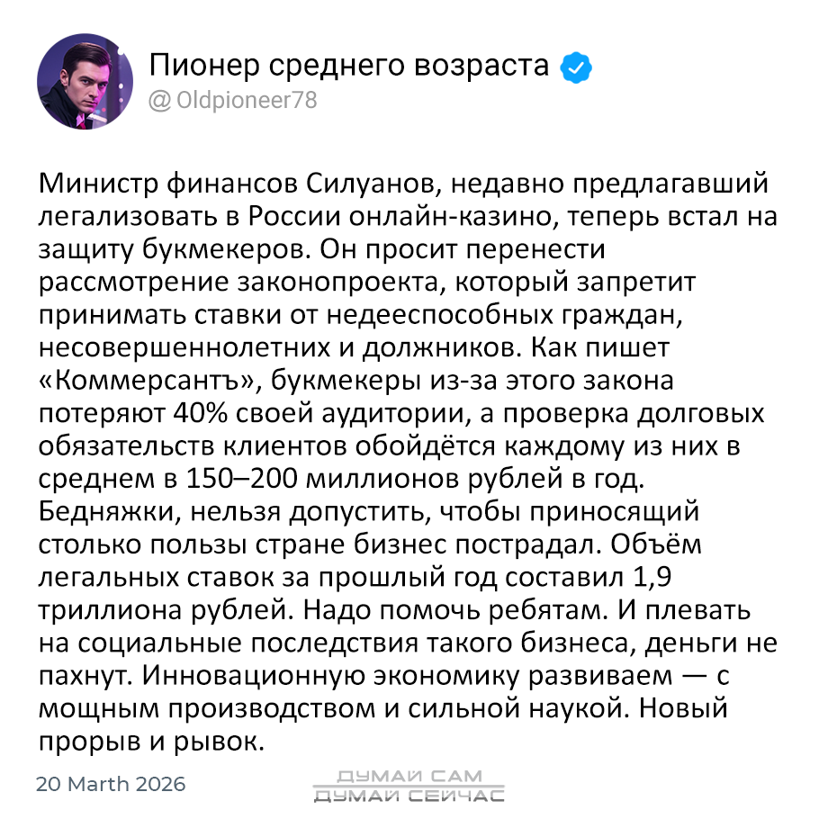 Министр финансов Силуанов, недавно предлагавший легализовать в России онлайн-казино, теперь встал на защиту букмекеров (https://www.kommersant.ru/doc/8514412). Он просит перенести рассмотрение законопроекта, который запретит принимать ставки от недееспособных граждан, несовершеннолетних и должников. Как пишет «Коммерсантъ», букмекеры из-за этого закона потеряют 40% своей аудитории, а проверка долговых обязательств клиентов обойдётся каждому из них в среднем в 150–200 миллионов рублей в год. Бедняжки, нельзя допустить, чтобы приносящий столько пользы стране бизнес пострадал. Объём легальных ставок за прошлый год составил 1,9 триллиона рублей. Надо помочь ребятам. И плевать на социальные последствия такого бизнеса, деньги не пахнут.