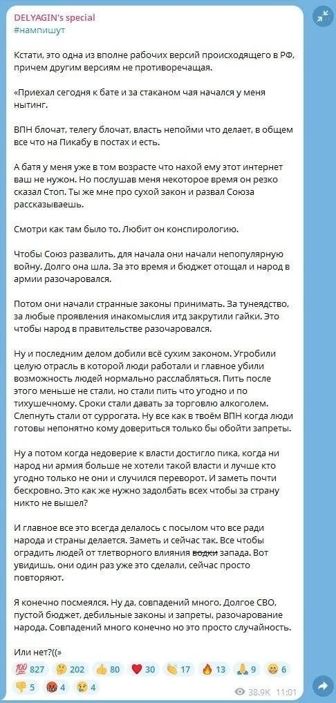 Сейчас ситуация как на закате СССР. Там так же была непонятная народу война, странные запреты и ограничения; интернет конечно не замедляли, но идиотский сухой закон ввели - что в текущее время почти одно и то же.