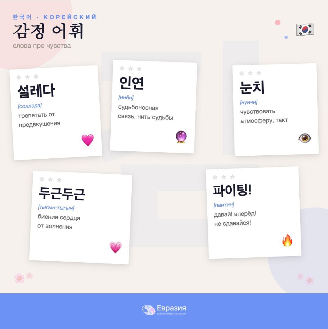 Про чувства, которые сложно перевести одним словом 🩷 🩷 설레다 [соллэда] — трепет от предвкушения 🔮 인연 [инён] — судьбоносная связь 👁️ 눈치 [нунчи] — умение чувствовать атмосферу 💗 두근두근 [тыгын-тыгын] — сердцебиение от волнения 🔥 파이팅! [паитин] — давай! вперёд! Сохрани и повторяй 📌 🌸 Подписаться на канал | Дать нам буст | Канал в MAX