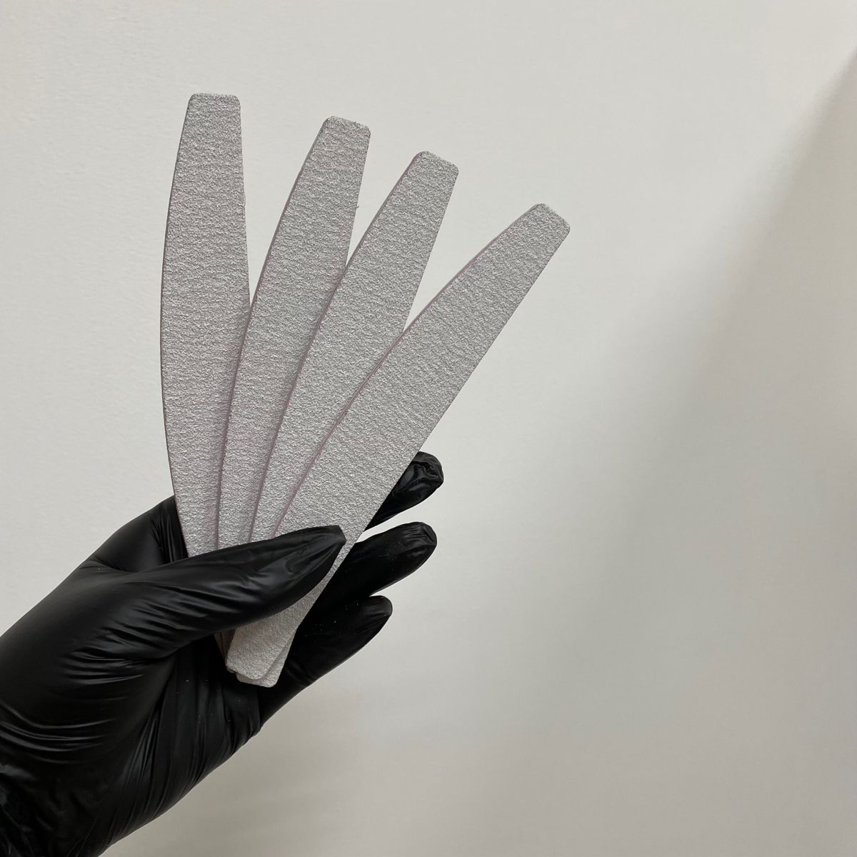 - Наращенные ногти (гель/акрил): Только пластик (так как с него легче счистить опил) и абразив 100-150. Картон моментально забивается и теряет свойства на искусственном материале.