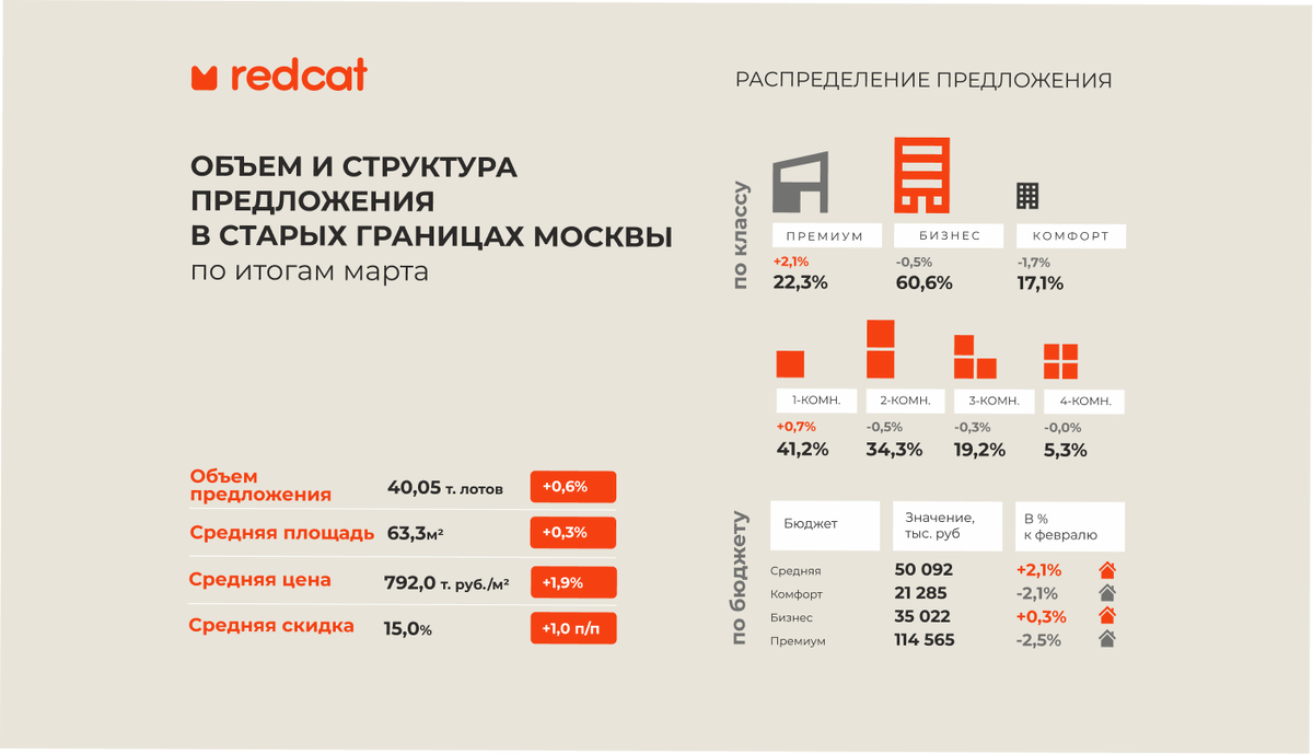 В марте девелоперы активизировались, количество новых объектов за месяц увеличилось в 2 раза, а при сравнении год к году показатели марта текущего, обогнали прошлый на 48%. В течение месяца на рынок вышло 7 новых проектов, причем все премиального сегмента, также объемы пополнились 7 новыми корпусами в уже реализуемых комплексах, новые корпуса по программе реновации в марте не выходили. В марте продолжился начатый в феврале медленный прирост объемов предложения. Сейчас в старых границах экспонируется 40,05 тыс. квартир и апартаментов, это на 0,6% больше, чем было феврале и на 10,2% меньше уровней марта 2025 года. В марте основной рост объемов был сконцентрирован в сегменте премиум-класса, за месяц предложение в дорогом сегменте увеличилось на 11,3%, в сегменте бизнес-класса изменения были минимальны – объемы снизились на 0,2%, а сегмент комфорт-класса потерял существенную часть объемов (-8,4%). За счет такого смещения доля премиум-класса выросла на 2,1 п/п и составила 22,3%, доля бизнес
