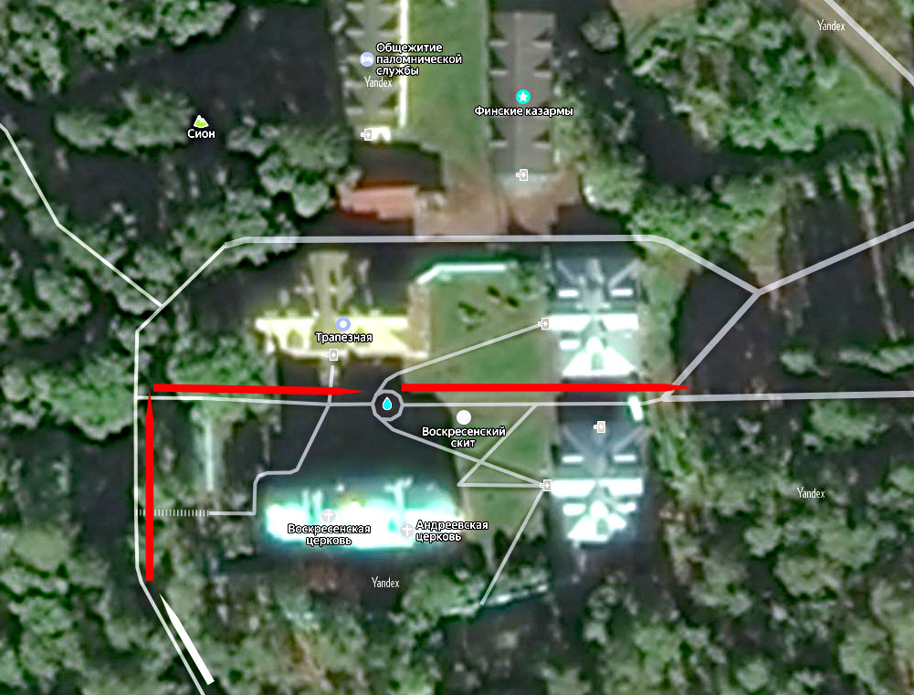 В предыдущей статье началась наша прогулка к Воскресенскому скиту Валаамского монастыря – мы остановились на склоне горы Сион пoд стенами скита. Сегодня пройдём на территорию скита, осмотрим его внутри ограды. Попасть в Воскресенскую церковь, к сожалению, не удалось. Воскресенский скит – один из самых почитаемых скитов на Валааме. Скит расположен на месте, где, согласно древнему Валаамскому преданию, апостол Андрей Первозванный установил каменный крест (или апостольский жезл), освятив скалистые берега и предсказав великое будущее Валааму. Впоследствии здесь была сооружена часовня во имя святого Андрея, возобновлённая в 1846 году. Воскресенский скит был основан в 1896 году усилиями и пожертвованиями благотворителя и паломника И.М.Сибирякова. При приближении к скиту с дорожки в первую очередь открывается вид на колокольню Воскресенской церкви и часть западной ограды скита. В первом ярусе колокольни устроен портал Воскресенской церкви, к которому по склону ведёт лестница. Тот же ракурс сп