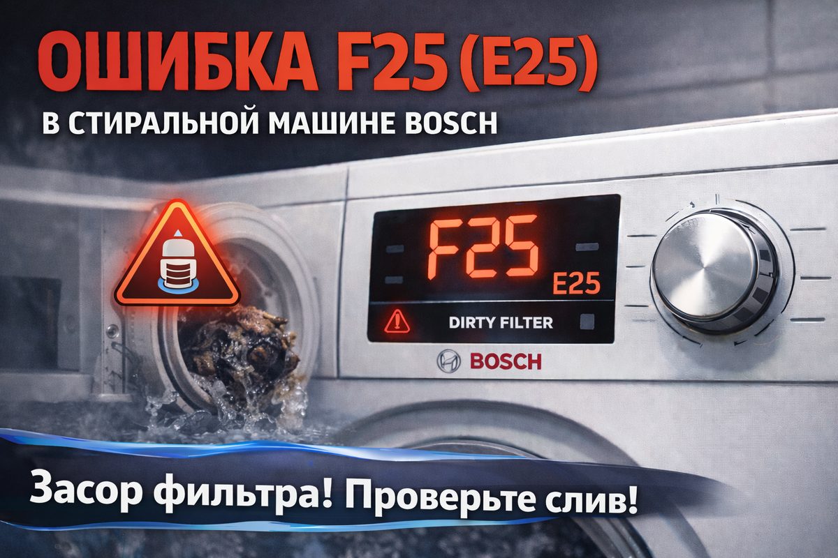 Стиралка Bosch может внезапно «задуматься» во время цикла: стирка тянется дольше обычного, полоскание идёт странно — и появляется F25 или E25. В большинстве случаев это связано не с водой или сливом напрямую, а с датчиком мутности воды (AquaSensor), который контролирует чистоту воды во время стирки. F25 (E25) — это ошибка датчика мутности воды (AquaSensor). Машина не может корректно определить, насколько вода грязная, и поэтому неправильно управляет стиркой/полосканием. 👉 Проще: Bosch «не понимает», когда вода стала чистой. Основные причины связаны с датчиком и качеством воды: Хорошая новость: часто проблему можно решить без ремонта. Мини-чек-лист: Если после очистки и сброса ошибка возвращается, вероятно: Чтобы понять, где находится датчик именно в вашей модели Bosch и какие запчасти подходят, удобно заглянуть на https://boschome.ru/ — это помогает быстрее сориентироваться перед ремонтом. Если нужно быстро определить причину ошибки F25/E25 и решить проблему: