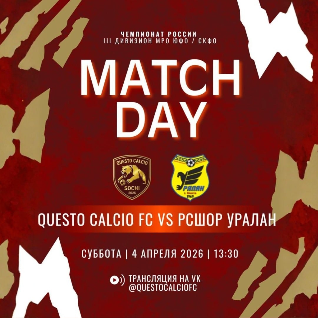 ! Друзья, родители, самая крутая футбольная семья! 🔥 Завтра происходит то, ради чего мы всё это затевали. Команда ❗️❗️❗️❗️❗️❗️❗️ (наша гордость, между прочим!) выходит на свой ПЕРВЫЙ официальный бой в Чемпионате России, III Дивизион МРО ЮФО/СКФО. Да-да, те самые мальчишки, которые ещё недавно гоняли мяч на сборах 🏫 «Торино», теперь будут доказывать своё право на победу на взрослом уровне. Это не «попрыгали-попинали». Это — жесткая мужская работа. И наш тренер, 👨 итальянец с лицензией UEFA Pro, готовит для соперников сюрпризы. 🧠⚽️ 🙌 КАК БОЛЕТЬ? Два варианта: 📍 Вы в Сочи или Адлере? Приходите на стадион «Юность» в Адлере! 🏟 Планируется много активностей: розыгрыши, конкурсы, футбольные челленджи — скучно не будет. Живая поддержка заряжает команду мощнее любой тактики! 📺 Вы далеко от Сочи? Включайте трансляцию и болейте сердцем ❤️ Где и когда: 🗓 СУББОТА | 4 АПРЕЛЯ 2026 ⏰13:30 📹 Трансляция: https://vk.com/questocalciofc 📈 А теперь — для тех, кто хочет большего. П