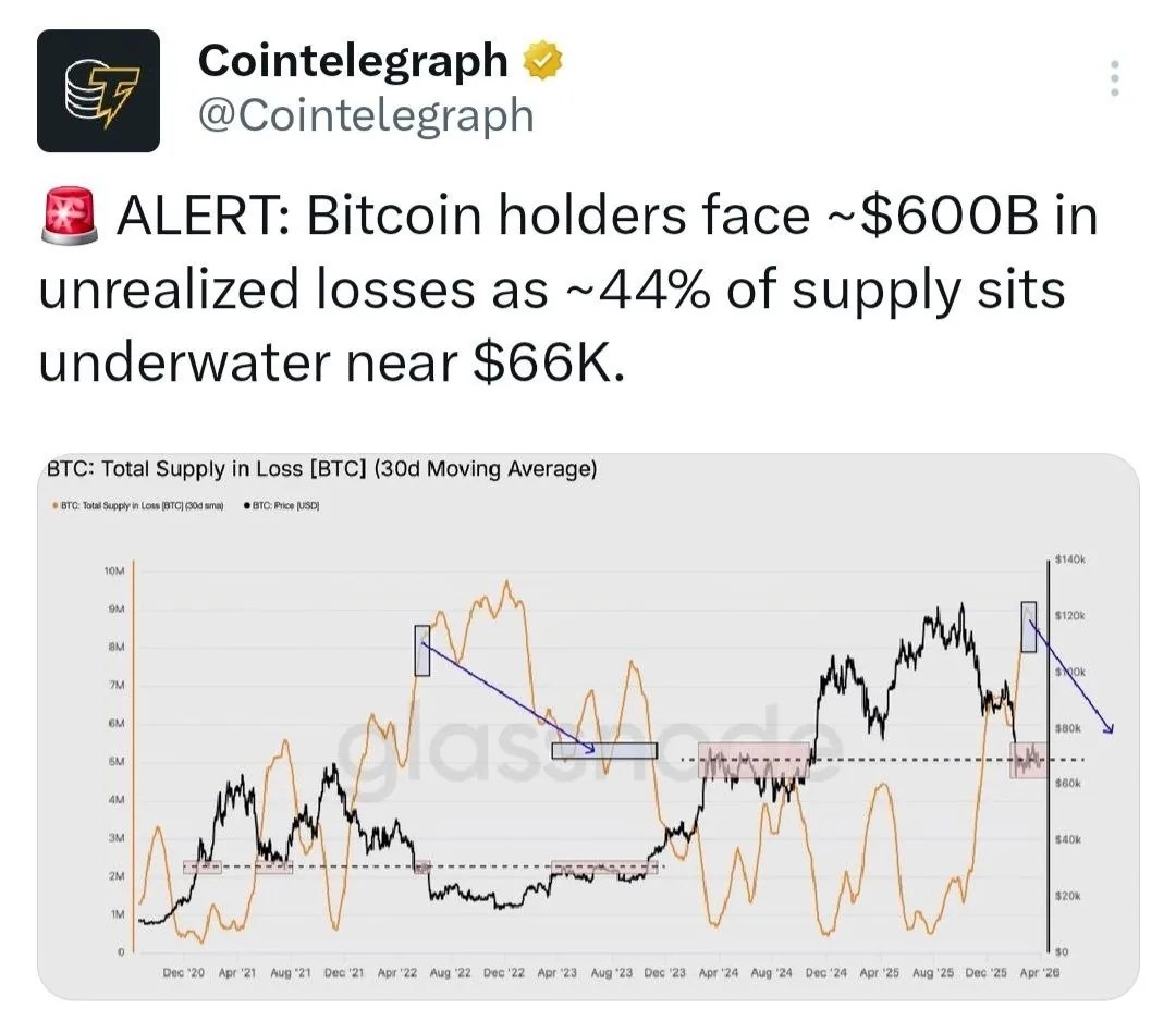Биткоин-инвесторы в глубоких убытках: 600 млрд долларов нереализованных потерь при цене покупки выше 80 000