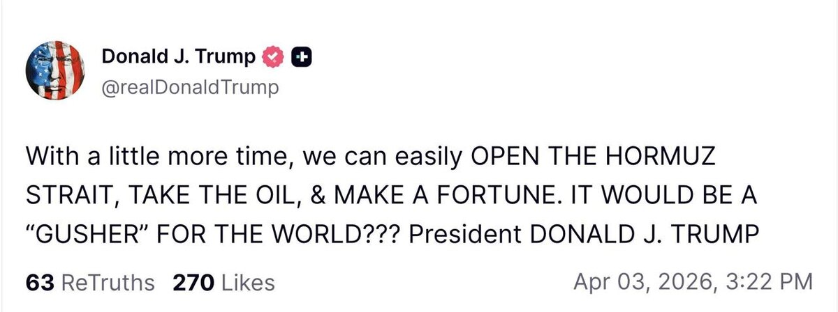 "Еще немного времени, и мы сможем с легкостью открыть Ормузский пролив, взять нефть и разбогатеть", - написал Трамп в соцсети Truth Social. При этом американский президент хочет в 2027-м фингоду увеличить военный бюджет США до рекордных $1,5 трлн. 🔴 Читайте Sputnik Беларусь в MAX